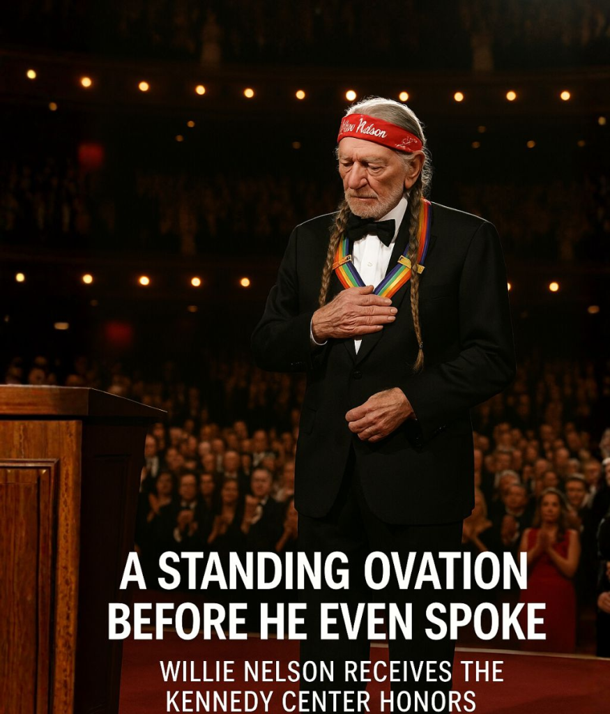 Tonight, beneath the golden glow of the Kennedy Center lights, Willie Nelson took his place among America’s most cherished cultural legends. But before he could even rise from his seat, the entire room stood — a full standing ovation given not to a moment, but to a lifetime. It was quiet, emotional, almost sacred.