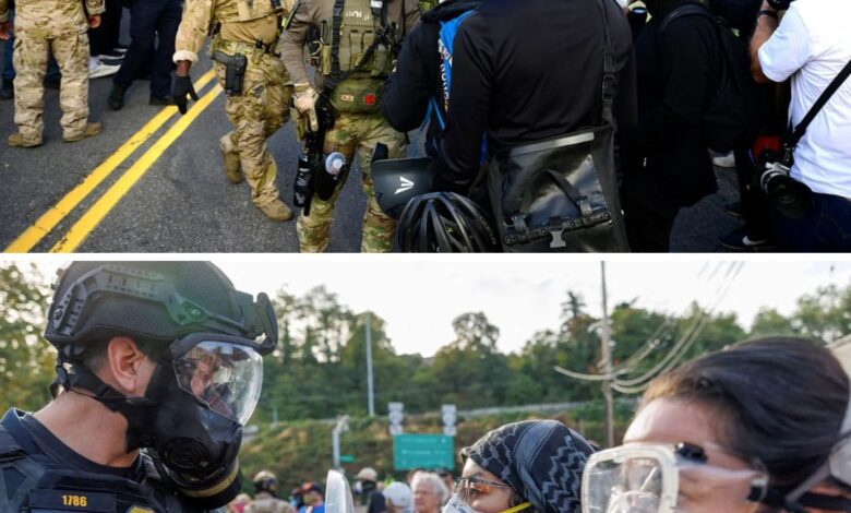 Federal agents face off with protesters outside the ICE building in Portland, on Sept. 28, following President Trump’s order to deploy military troops to protect ICE facilities. (Mathieu Lewis-Rolland/Getty Images)