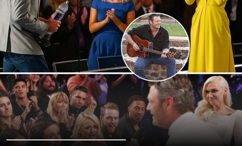 It wasn’t polite applause. It was thunderous, heartfelt, roaring. Blake stepped back from the mic, visibly overwhelmed. His eyes glistened, his head bowed slightly as if in quiet reflection. Gwen rose, clapping proudly, her eyes full of emotion.