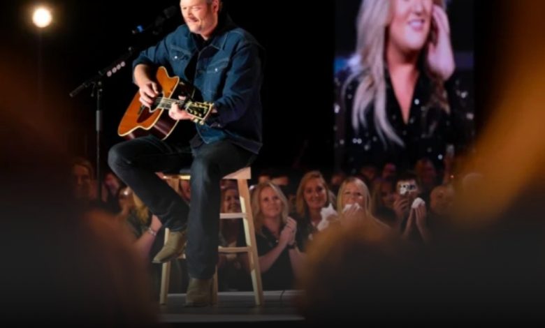 Blake didn’t come out with flashing lights or a roaring band behind him. He walked to the center of the stage alone, head lowered, thumb brushing the worn strings of his guitar. The crowd felt it instantly — the weight, the tenderness, the pain he was carrying for someone he cared about deeply.