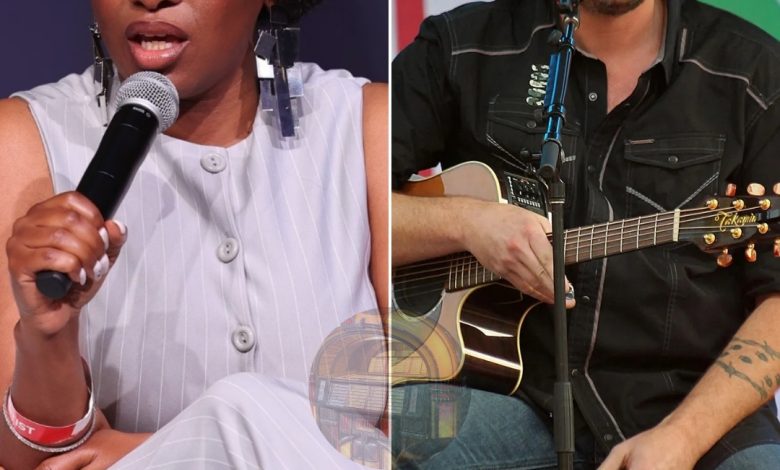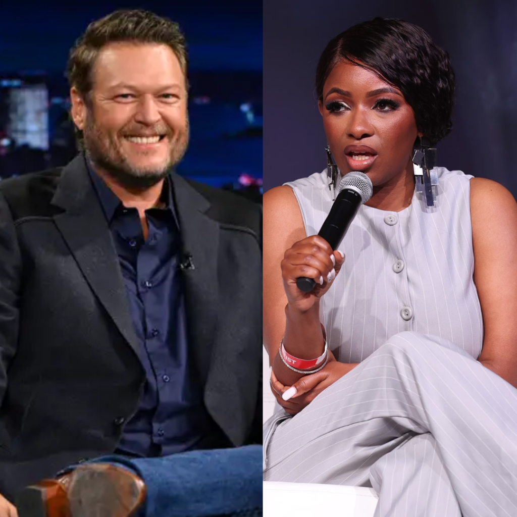 Blake Shelton, relaxed in a dark blazer and open-collar shirt, sat across from Jasmine Crockett, portrayed here as a sharp-tongued political figure known for her rapid-fire commentary. The topic: cross-industry charity work—how entertainers and lawmakers can unite to support veterans, disaster relief, and rural communities.
