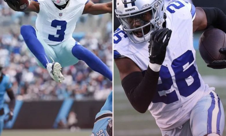 Dallas Cowboys wide receiver George Pickens jumps over Carolina Panthers safety Nick Scott. / Cory Knowlton-Imagn Images