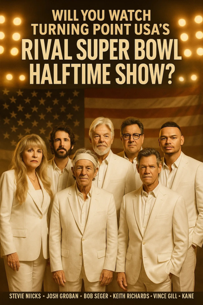 In a groundbreaking announcement live from Nashville, Stevie Nicks, Josh Groban, Bob Seger, Keith Richards, Vince Gill, Randy Travis, and Kane Brown will come together for “The All-American Halftime Show” — a once-in-a-lifetime event celebrating faith, freedom, and the enduring heart of the American spirit.
