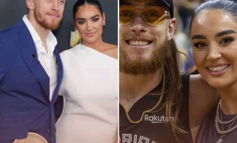 Jan 30, 2024; San Francisco, California, USA; San Francisco 49ers tight end George Kittle and wife Claire Kittle at a game between Golden State Warriors and Philadelphia 76ers during the second quarter at Chase Center. Mandatory Credit: Neville E. Guard-USA TODAY Sports