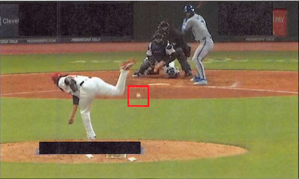 The federal indictment against Guardians closer Emmanuel Clase includes this photo that shows a pitch thrown in the dirt well in front of home plate. Federal prosecutors say the pitcher deliberately threw the pitch so bettors would make money on wagers.Federal indictment