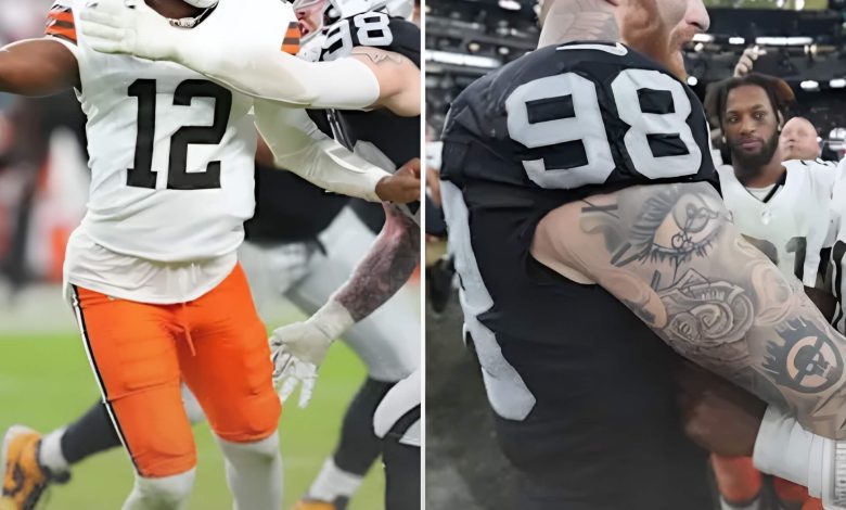Nov 23, 2025; Paradise, Nevada, USA; Las Vegas Raiders defensive end Maxx Crosby (98) and Cleveland Browns quarterback Shedeur Sanders (12) embrace after the game at Allegiant Stadium. Mandatory Credit: Kirby Lee-Imagn Images