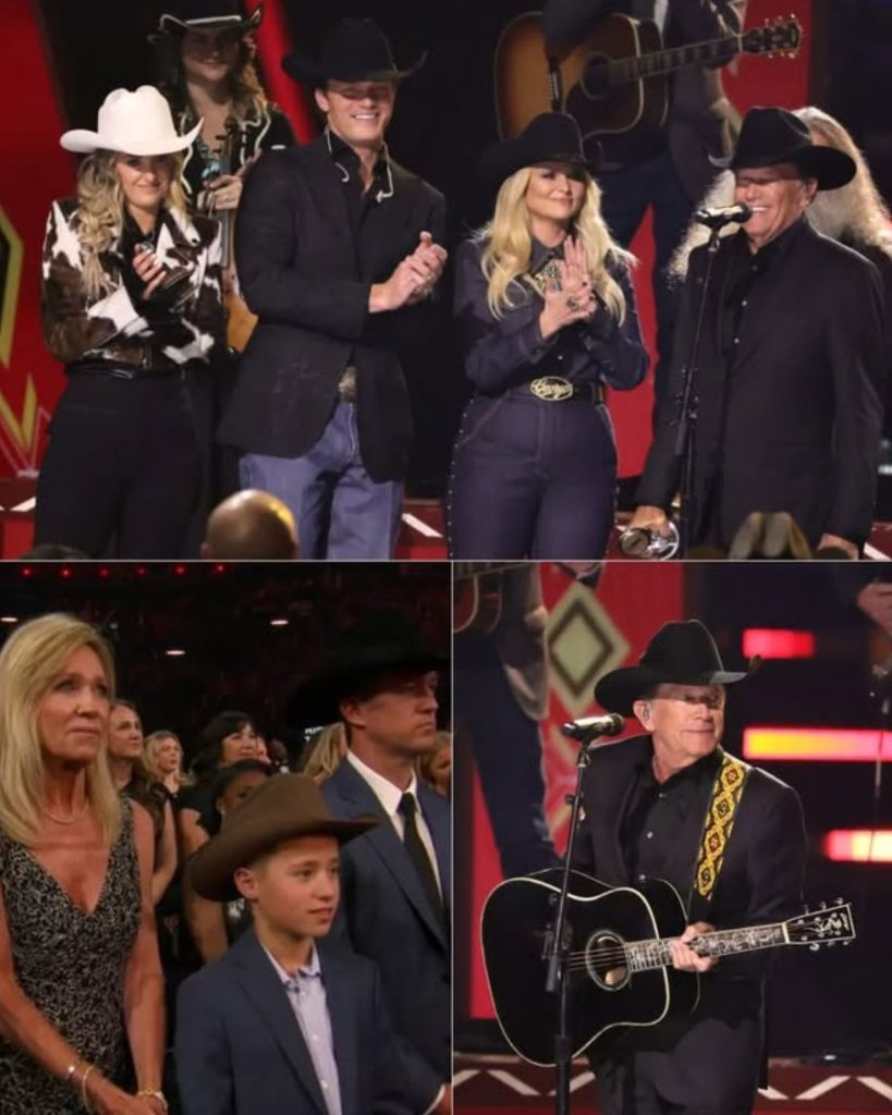 When George Strait accepted the award, the crowd rose once again to its feet. Dressed in his signature black cowboy hat and boots, he stood at the microphone with quiet humility. He didn’t need theatrics. His presence alone commanded attention.