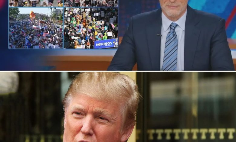 Stewart’s segment was classic Daily Show—grabbing the news by the horns and riding it hard. He showed footage of peaceful protests across major cities and mocked Republican efforts to smear them as “hate rallies,” cutting to clips of people in inflatable costumes singing “This Land Is Your Land.”