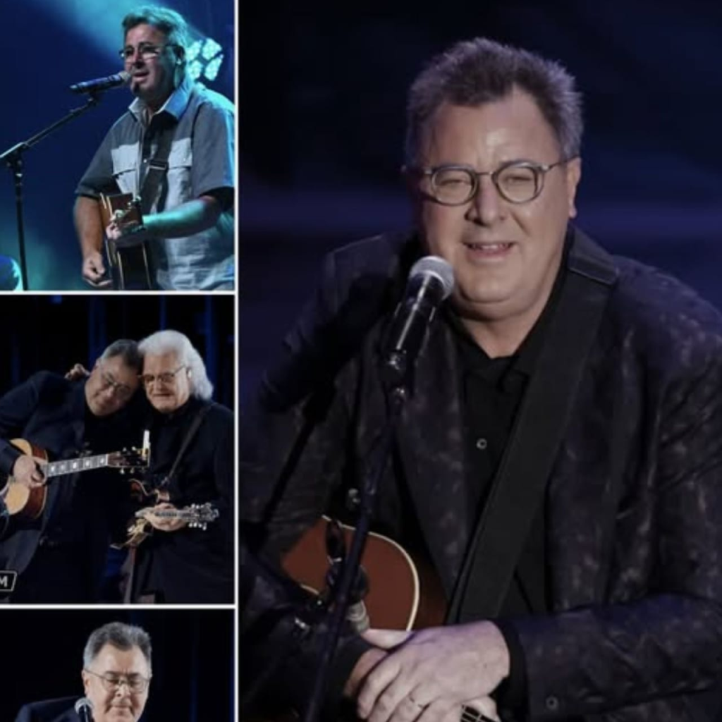 In this fan-envisioned emotional tribute, Vince Gill steps onto the arena stage with a solemn calm that instantly shifts the atmosphere. The crowd senses something deeper than a performance approaching—something sacred. The lights dim into a soft blue haze as Vince grips his guitar tightly, steadying his breath.