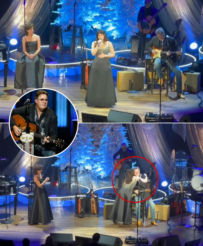 As the lights dimmed, Vince Gill stepped into the soft glow of center stage, guitar nestled against him like an old friend. But instead of beginning alone, he paused, turned toward the wings, and extended his hand.